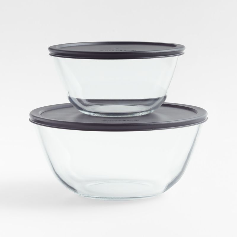 Outfitted with grey lids embossed with our logo, these two glass bowls provide a secure seal to keep food fresh in the fridge or on the go. Use the larger bowl to mix cake batter and the smaller to whip buttercream; the lids will keep your cake components fresh until you're ready to use them. Or make two crowd-pleasing side dishes in the bowls, seal with lids and transport to a potluck, picnic or holiday feast. The bowls also store leftovers securely in the freezer, reheating them easily in the microwave. This set includes 2.5- and 4-quart lidded bowls.