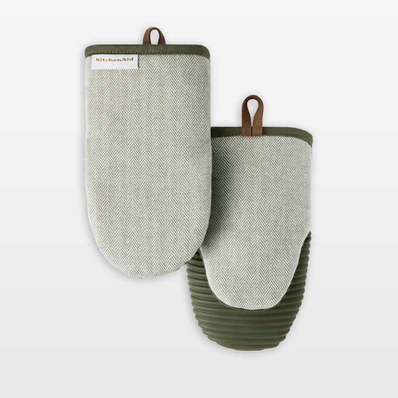 Protect yourself from heat as you cook or bake with this set of mini mitts designed with classic KitchenAid quality and style. Woven in a smart herringbone pattern in evergreen and cream, the cotton mitts and thick terry cloth lining shield hands against hot pans and oven racks. Flexible ribbed evergreen silicone coats the palms, providing a waterproof, slip-resistant grip and resisting heat up to 500°. Slipping on and off easily, the mini mitts look elevated hanging near your oven from their brown leather loops.