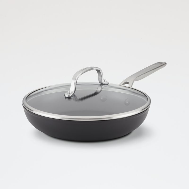 Three layers of non-stick coating on this hard-anodized aluminum frying pan stand up to everyday use to ensure food releases easily. Cleanup is a breeze, with the enhanced non-stick finish even on the handle rivets. Use the fry pan to cook up pancakes, steaks and vegetables, and add the glass lid to fry and steam potstickers or create the perfect sunny side-up eggs. Safe for use in the oven and dishwasher, the hard-anodized fry pan with lid offers durability and versatility for daily cooking.