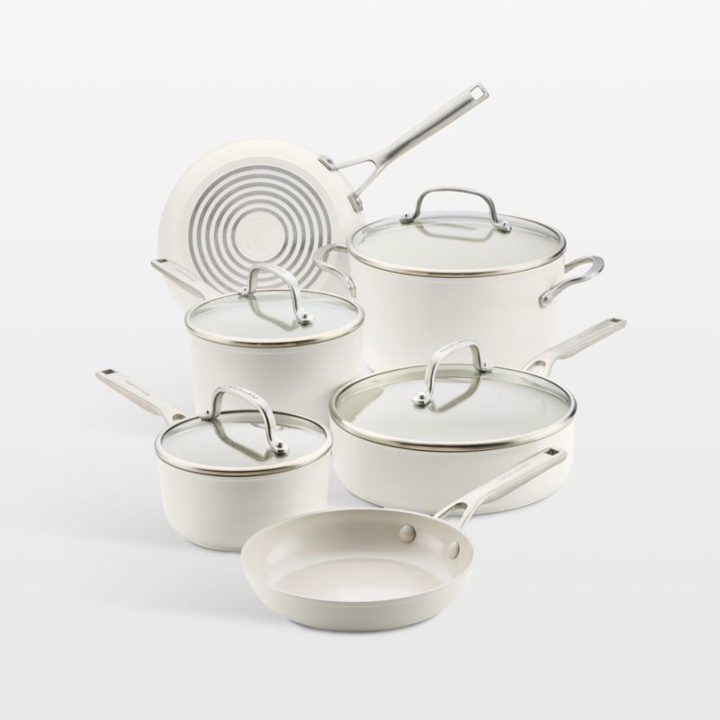 The ceramic non-stick coating on this cookware set stands up to everyday use to ensure food releases easily. Crafted of thick, forged hard-anodized aluminum, the durable pots and pans conduct heat efficiently. Creamy white ceramic interiors release food easily for quick cleanup, pairing perfectly with the exteriors finished in porcelain white—KitchenAid's warm and fresh neutral hue. Stay-cool stainless steel handles provide a safe and comfortable handhold, and shatter-resistant glass lids seal in moisture and heat. A fantastic wedding, housewarming or graduation gift, this set combines 8.25- and 10-inch frying pans, 1.5- and 3-quart saucepans with lids, 3-quart saute pan with lid and 6-quart stockpot with lid.