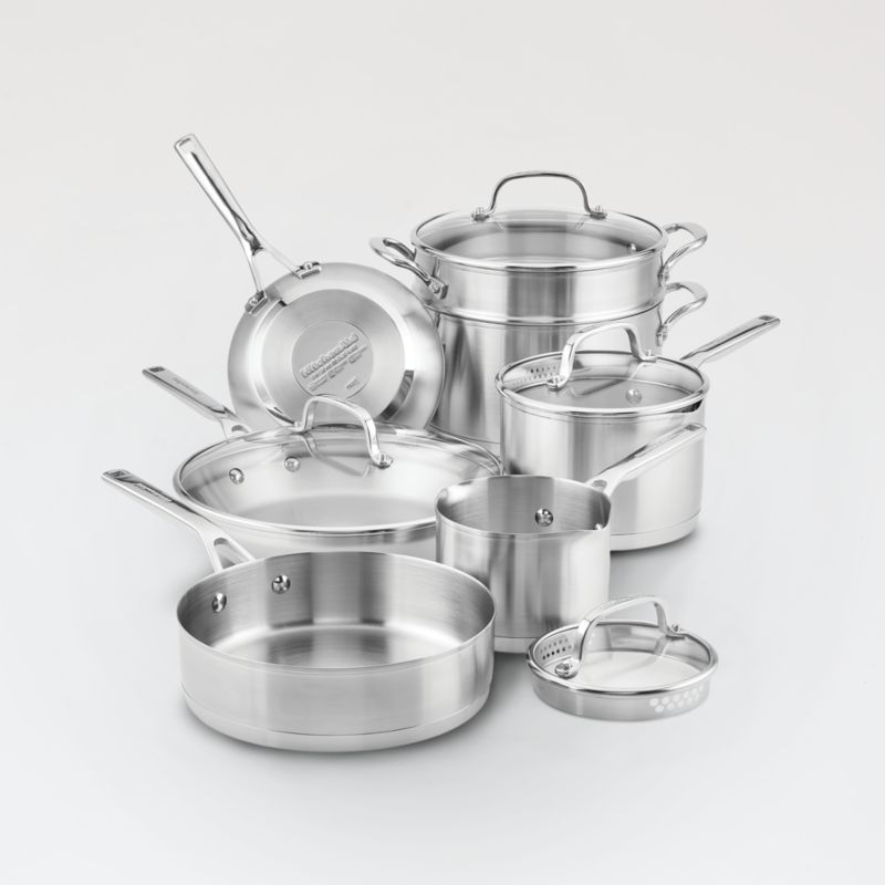 Sandwiched between two layers of heavy-duty stainless steel, an extra-thick layer of conductive aluminum distributes heat evenly from edge to edge of these pots and pans. Sauté and frying pans brown meat, vegetables and pancakes perfectly, while the saucepans and stockpot cook up soups, sauces and stews. With straining lids on the saucepans and etched measurement markings on the stockpot interior to aid in adding ingredients, the durable stainless steel cookware stands up to daily use and cleans up easily in the dishwasher. Ideal for a wedding, housewarming or graduation gift, the 11-piece set includes a 1.5-quart lidded straining saucepan, 3-quart lidded straining saucepan, 6-quart lidded stockpot, 3-quart saute pan, 8" frying pan, 11" frying pan with lid and 3.75-quart steamer insert that fits in 6-quart stockpot.