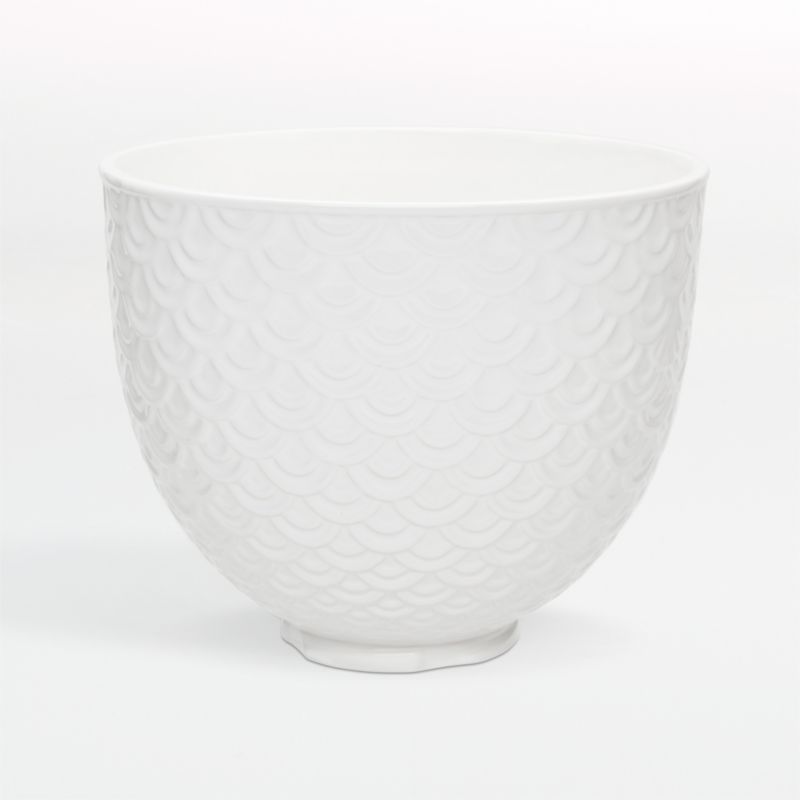 Customize your KitchenAid stand mixer with this white titanium-reinforced ceramic bowl embossed with a lacy dimensional design inspired by a traditional Japanese fish-scale pattern. Ideal for chilling dough or melting chocolate, the bowl boasts great heat and cold retention and may be used in the freezer, microwave and oven then cleans up easily in the dishwasher. This bowl fits all KitchenAid 4.5- and 5-quart tilt-head stand mixers and resists chipping, cracking, crazing and staining. Finished in a reactive white glaze, the mermaid lace mixing bowl makes a sweet gift for bakers who love their KitchenAid mixers.