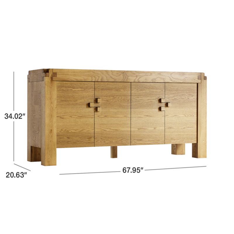 There's a wealth of woodworking artistry at work in our Knot sideboard. Made of solid white oak and white oak veneer, the farmhouse-style sideboard frames dramatic cathedral-grained doors in a waterfall silhouette marked by expert marquetry. The pattern play culminates at the sideboard's corners with an artisanal show of inset Japanese-style joinery and a cut-out notch, each element of the dimensional design expertly hand sanded. Block-like pulls interact in fascinating asymmetry, accentuating the geometric design and providing access to two adjustable shelves. A Crate and Barrel exclusive, the Knot sideboard is made of solid white oak and white oak veneer.