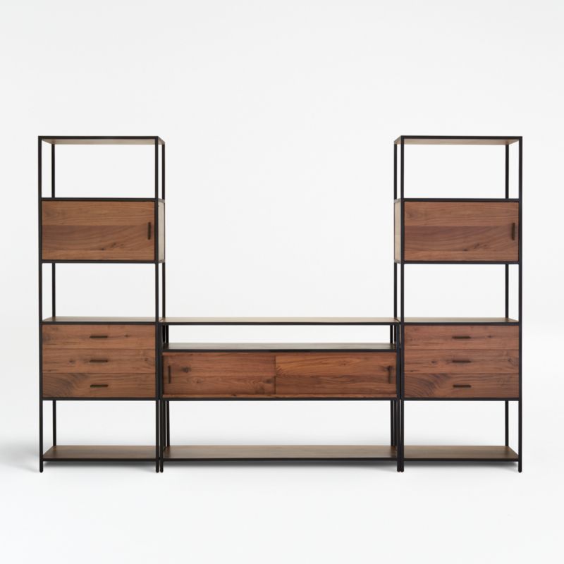 Doors, shelves and drawers of solid black walnut are set within slim, architectural iron frames in the handcrafted Knox collection. The clean-lined mix of open and closed storage provides a versatile design that works well in any room.