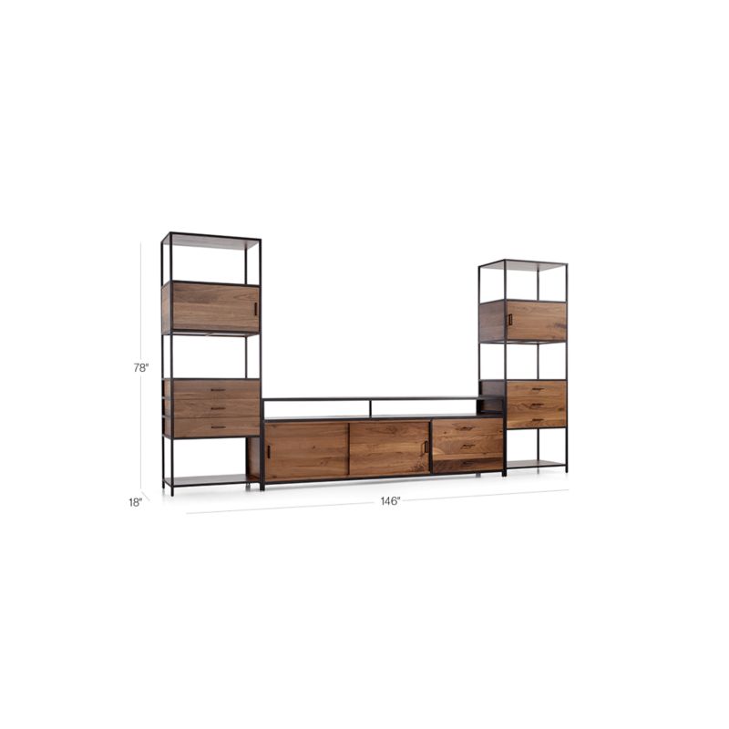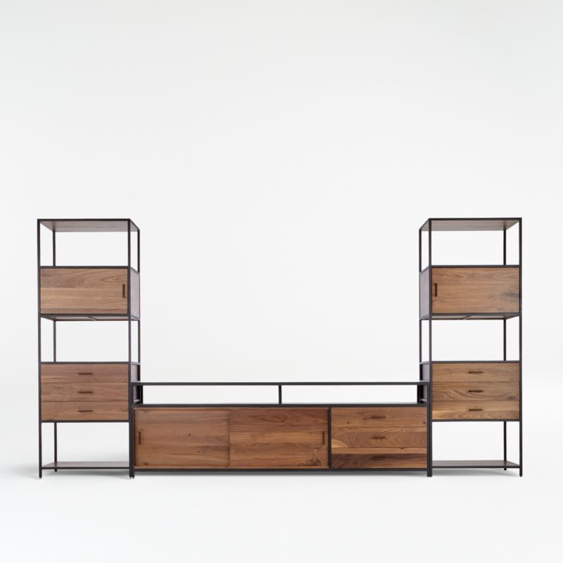 The Knox Black Industrial Media Console with 2 Tall Open Bookcases is a Crate and Barrel exclusive.