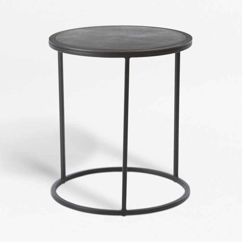 The open frame has a closed circle base that supports a textured sand-cast-aluminum top, enhanced with an antiqued bronze finish. This small accent table pairs with the coordinating large Knurl table, tucking under it for a two-tiered, two-toned look. Due to its handcrafted nature, tables may vary in surface texture. The Knurl Small Accent Table is a Crate and Barrel exclusive.