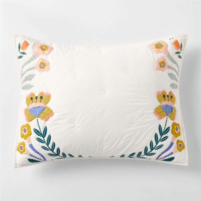 In a colorful convergence of flora and fauna, our organic cotton Koshi bedding gives traditional folk art a kid-approved refresh with whimsical designs in modern hues. Botanicals grow across the pillow sham's bottom edge and up both sides, lookin' especially lush and colorful against the cream-colored cotton. Complete this sweet-and-chic bedding look with our coordinating Koshi quilt and sheet set.