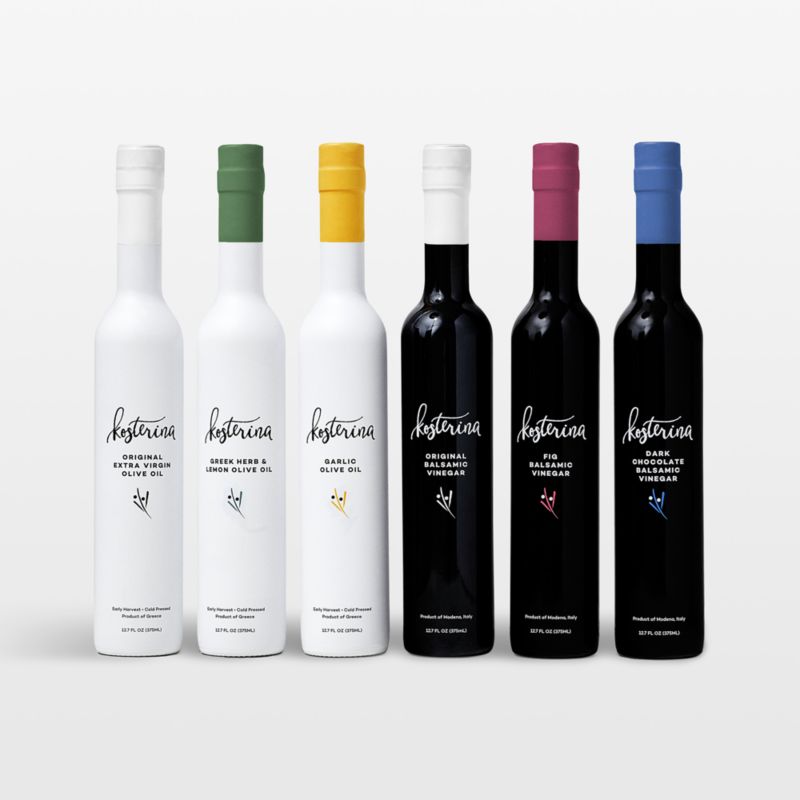 Give your tastebuds a delicious sampling of Kosterina's premium olive oil and vinegars in this six-piece set. Combining classic flavors and edgy innovations, the vinegar selection includes Fig Balsamic Vinegar made from Lambrusco and Trebbiano grapes, a perfectly balanced Classic Balsamic Vinegar from Moderna, Italy, and the intensely aromatic Dark Chocolate Balsamic Vinegar. The three extra-virgin olive oils include Original made from early-harvest Koroneiki olives; Greek Herb and Lemon flavored with oregano, onion, lemon and black pepper oils; and the robust Garlic.