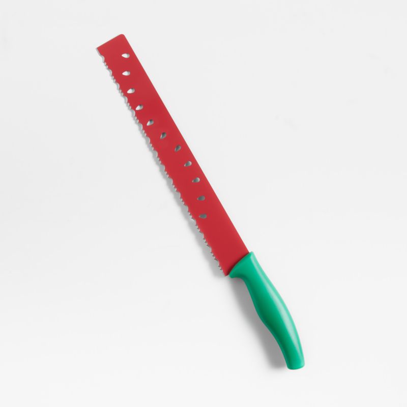 Bright red with seed-like cutouts and a green handle, this knife looks the part to slice watermelon easily and efficiently. Extra long in length to tackle even the largest melons, the knife has an extra-sharp serrated blade to cut through tough rinds and a nonstick coating to make neat slices that release from the blade. The matching sheath lets the knife travel safely for slicing up melons at picnics or for camping trip snacks.