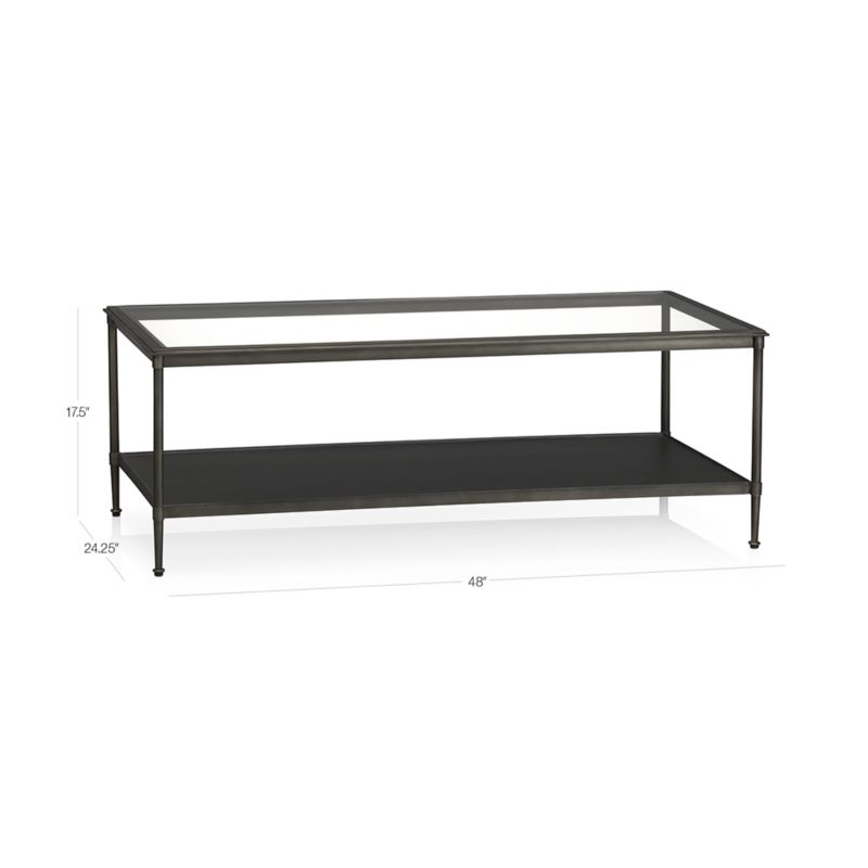 Hand-crafted tubular steel legs, subtly tapered bun feet, corner band joints and multi-level framing of the tempered glass top add classic references to the coffee table's clean-lined design. A five-step finish lends depth, highlights and brushed-edge details to the warm pewter finish. The Kyra Coffee Table is a Crate and Barrel exclusive.