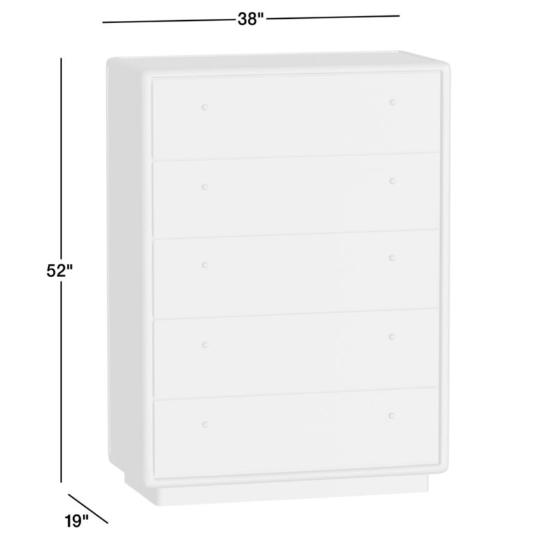 Part of our top-selling bedroom collection, the Lafayette dresser updates the bed's rounded contours with clean lines and a fresh pearl grey finish. Radiused edges soften the dresser's square silhouette, while a recessed plinth base lets it float in the bedroom. Made of white oak, the dresser is given a bleached ash finish to accentuate the wood's cathedral grain. Petite, hand-sculpted pulls with a burnished brass patina dot the tall dresser's five drawers, adding to its refined appearance.