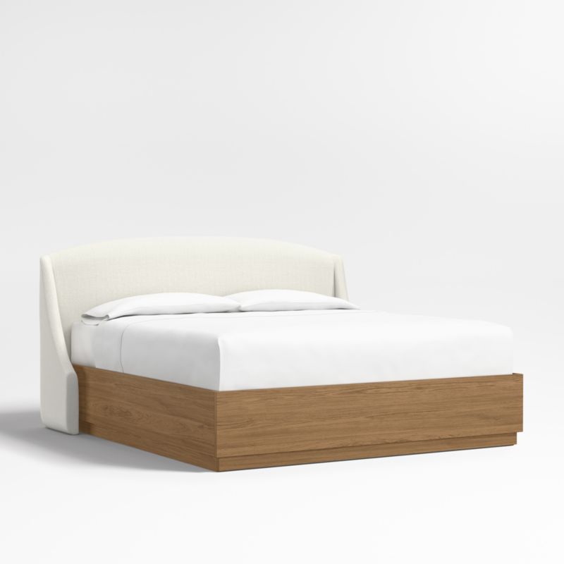 Our custom bed collection lets you mix and match our top-selling headboards and bases for a look that's truly yours. The Lafayette headboard gives your bed the sumptuous curves of a French-style chaise with a rounded top and sloped wings. Upholstered in an ivory textured weave, the elegant headboard pairs beautifully with the Batten bed base, which features a sleek plinth design and the lively grain of oak veneer enhanced with a smoke grey finish. A great choice for storage-challenged bedrooms, Batten seamlessly integrates a drawer at the foot of the base for placing bedding, blankets and out-of-season garments.