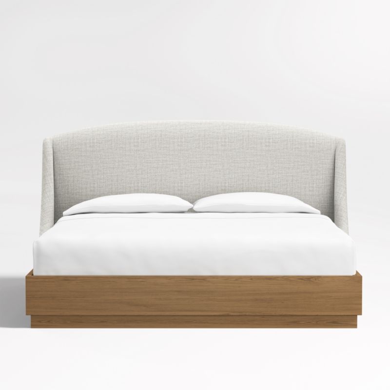 Our custom bed collection lets you mix and match our top-selling headboards and bases for a look that's truly yours. The Lafayette headboard gives your bed the sumptuous curves of a French-style chaise with a rounded top and sloped wings. Upholstered in a misty grey textured weave, the elegant headboard pairs beautifully with the Batten bed base, which features a sleek plinth design and the lively grain of oak veneer enhanced with a smoke grey finish.