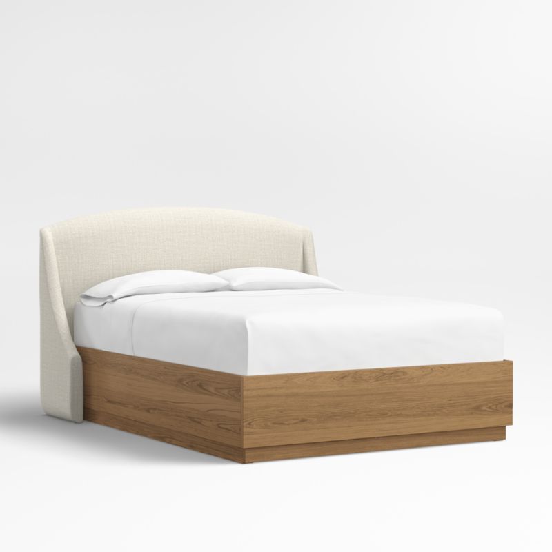 Our custom bed collection lets you mix and match our top-selling headboards and bases for a look that's truly yours. The Lafayette headboard gives your bed the sumptuous curves of a French-style chaise with a rounded top and sloped wings. Upholstered in a beige textured weave, the elegant headboard pairs beautifully with the Batten bed base, which features a sleek plinth design and the lively grain of oak veneer enhanced with a smoke grey finish. A great choice for storage-challenged bedrooms, Batten seamlessly integrates a drawer at the foot of the base for placing bedding, blankets and out-of-season garments.