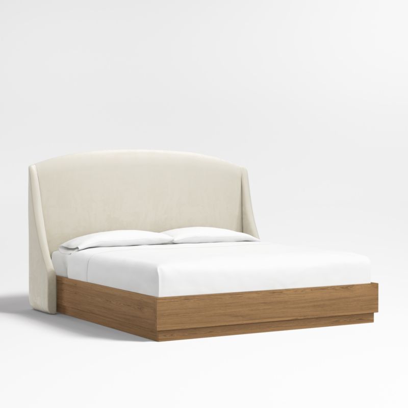 Our custom bed collection lets you mix and match our top-selling headboards and bases for a look that's truly yours. The Lafayette tall headboard gives your bed the sumptuous curves of a French-style chaise with a rounded top and sloped wings. Upholstered in beige faux mohair, the elegant headboard pairs beautifully with the Batten bed base, which features a sleek plinth design and the lively grain of oak veneer enhanced with a smoke grey finish.