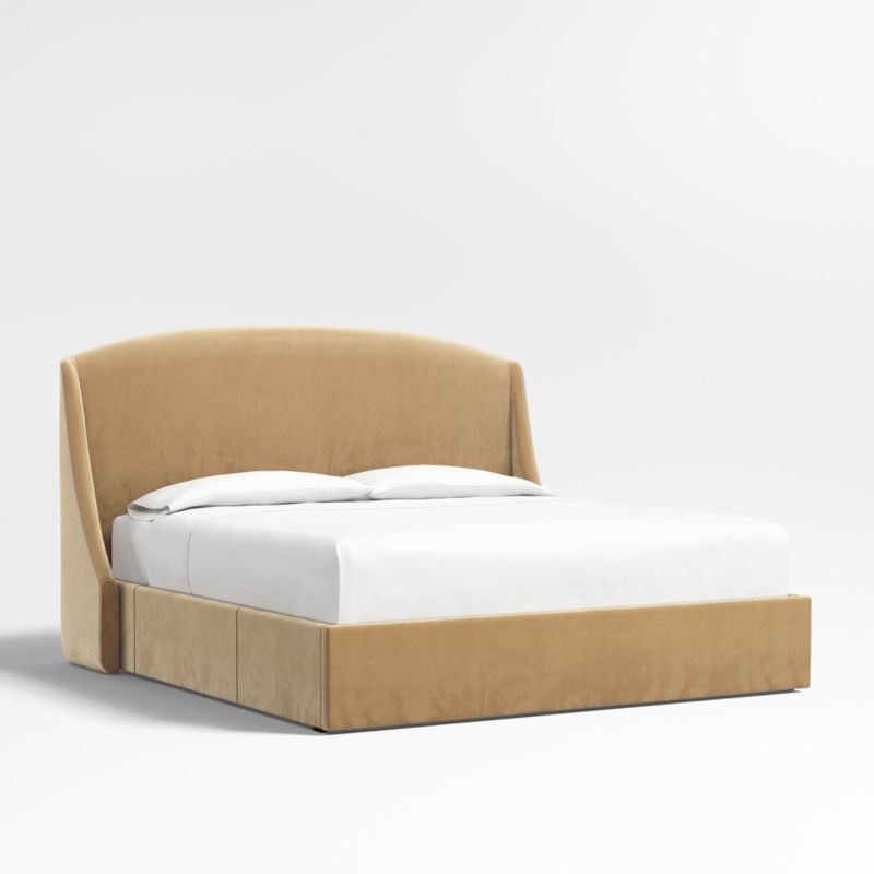 Our custom bed collection lets you mix and match our top-selling headboards and bases for a look that's truly yours. The Lafayette tall headboard gives your bed the sumptuous curves of a French-style chaise with a rounded top and sloped wings. The base integrates three roomy drawers—one on each side and one at the foot of the bed—for storing off-season clothes and extra blankets. As a plus, the side drawers open with just enough clearance to avoid hitting nightstands and other bedroom furniture. Both pieces are upholstered in camel brown faux mohair.