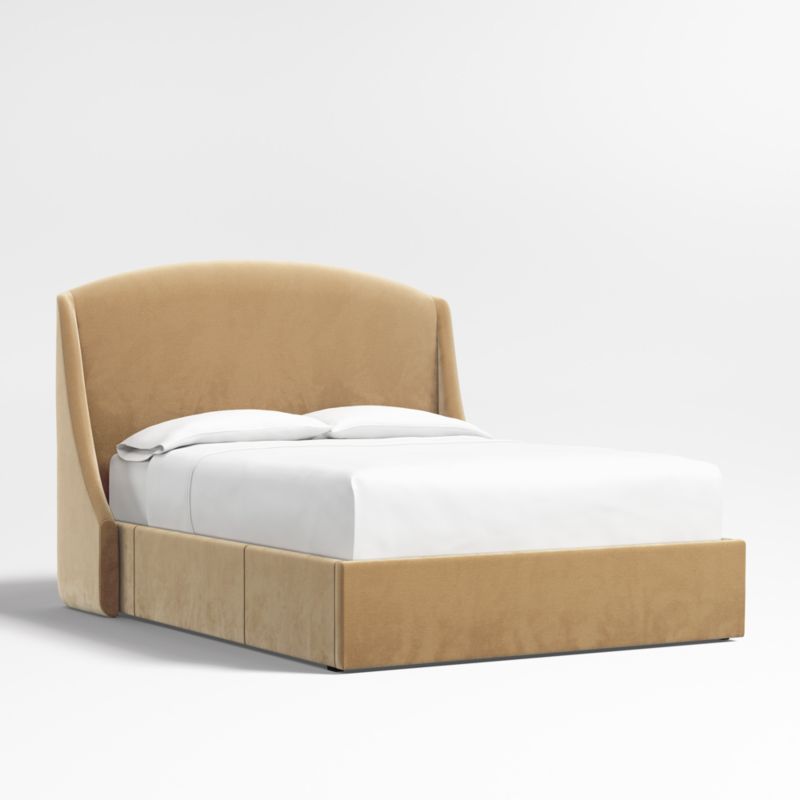 Our custom bed collection lets you mix and match our top-selling headboards and bases for a look that's truly yours. The Lafayette tall headboard gives your bed the sumptuous curves of a French-style chaise with a rounded top and sloped wings. The base integrates three roomy drawers—one on each side and one at the foot of the bed—for storing off-season clothes and extra blankets. As a plus, the side drawers open with just enough clearance to avoid hitting nightstands and other bedroom furniture. Both pieces are upholstered in camel brown faux mohair.