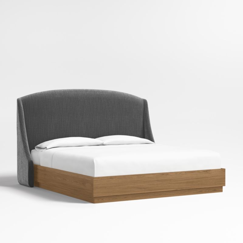 Our custom bed collection lets you mix and match our top-selling headboards and bases for a look that's truly yours. The Lafayette tall headboard gives your bed the sumptuous curves of a French-style chaise with a rounded top and sloped wings. Upholstered in a charcoal grey textured weave, the elegant headboard pairs beautifully with the Batten bed base, which features a sleek plinth design and the lively grain of oak veneer enhanced with a smoke grey finish.