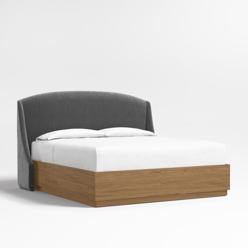 Our custom bed collection lets you mix and match our top-selling headboards and bases for a look that's truly yours. The Lafayette tall headboard gives your bed the sumptuous curves of a French-style chaise with a rounded top and sloped wings. Upholstered in a charcoal grey textured weave, the elegant headboard pairs beautifully with the Batten bed base, which features a sleek plinth design and the lively grain of oak veneer enhanced with a smoke grey finish. A great choice for storage-challenged bedrooms, Batten seamlessly integrates a drawer at the foot of the base for placing bedding, blankets and out-of-season garments.