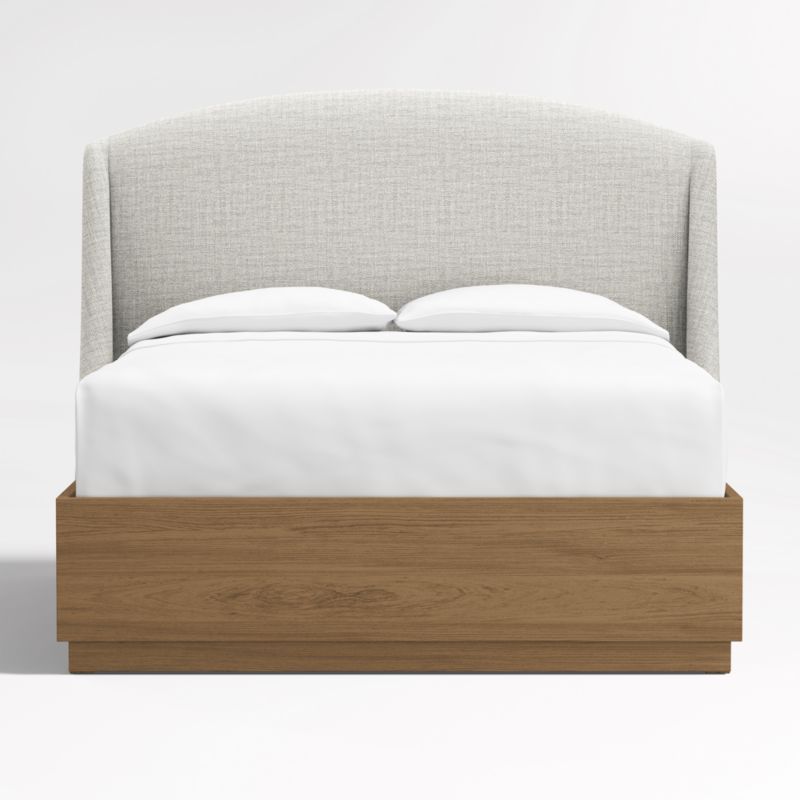 Our custom bed collection lets you mix and match our top-selling headboards and bases for a look that's truly yours. The Lafayette tall headboard gives your bed the sumptuous curves of a French-style chaise with a rounded top and sloped wings. Upholstered in a misty grey textured weave, the elegant headboard pairs beautifully with the Batten bed base, which features a sleek plinth design and the lively grain of oak veneer enhanced with a smoke grey finish. A great choice for storage-challenged bedrooms, Batten seamlessly integrates a drawer at the foot of the base for placing bedding, blankets and out-of-season garments.