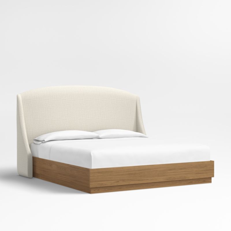 Our custom bed collection lets you mix and match our top-selling headboards and bases for a look that's truly yours. The Lafayette tall headboard gives your bed the sumptuous curves of a French-style chaise with a rounded top and sloped wings. Upholstered in a beige textured weave, the elegant headboard pairs beautifully with the Batten bed base, which features a sleek plinth design and the lively grain of oak veneer enhanced with a smoke grey finish.