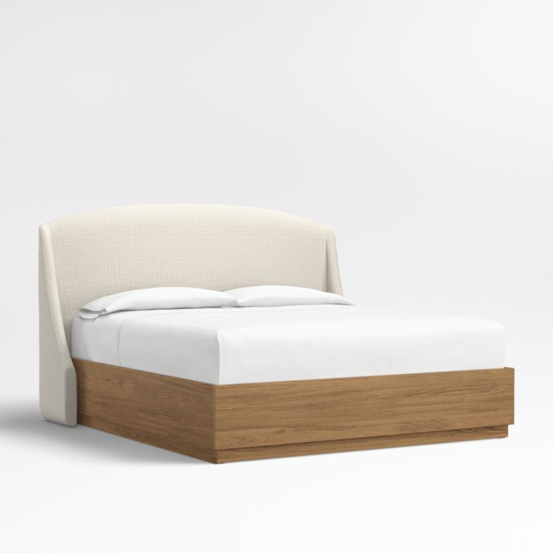 Our custom bed collection lets you mix and match our top-selling headboards and bases for a look that's truly yours. The Lafayette tall headboard gives your bed the sumptuous curves of a French-style chaise with a rounded top and sloped wings. Upholstered in a beige textured weave, the elegant headboard pairs beautifully with the Batten bed base, which features a sleek plinth design and the lively grain of oak veneer enhanced with a smoke grey finish. A great choice for storage-challenged bedrooms, Batten seamlessly integrates a drawer at the foot of the base for placing bedding, blankets and out-of-season garments.