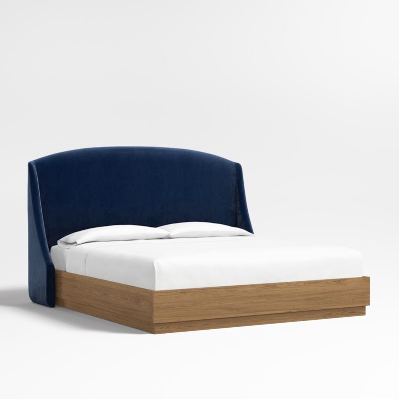 Our custom bed collection lets you mix and match our top-selling headboards and bases for a look that's truly yours. The Lafayette tall headboard gives your bed the sumptuous curves of a French-style chaise with a rounded top and sloped wings. Upholstered in navy blue faux mohair, the elegant headboard pairs beautifully with the Batten bed base, which features a sleek plinth design and the lively grain of oak veneer enhanced with a smoke grey finish.