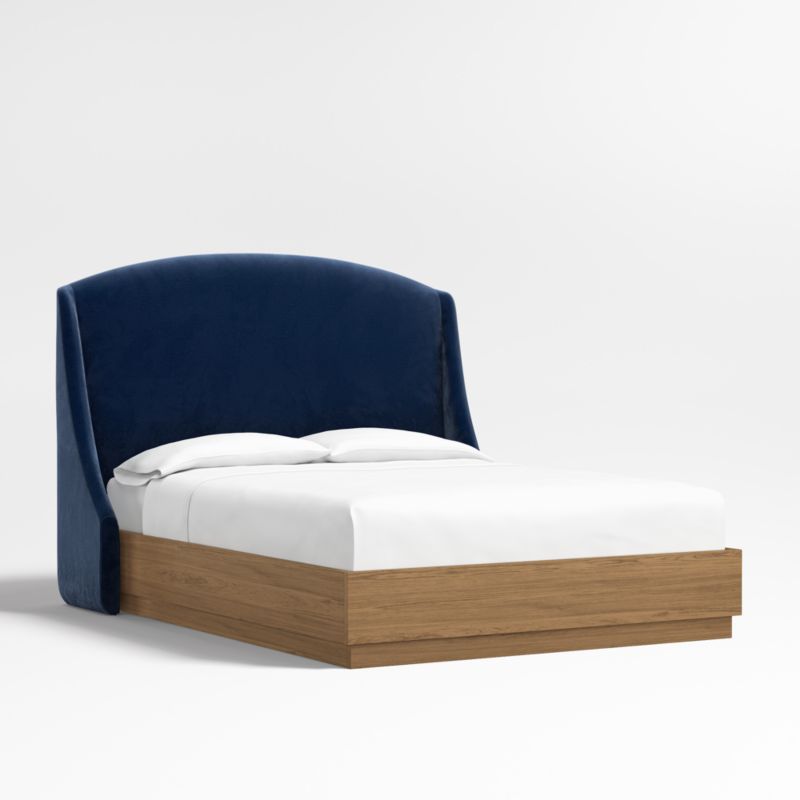 Our custom bed collection lets you mix and match our top-selling headboards and bases for a look that's truly yours. The Lafayette tall headboard gives your bed the sumptuous curves of a French-style chaise with a rounded top and sloped wings. Upholstered in navy blue faux mohair, the elegant headboard pairs beautifully with the Batten bed base, which features a sleek plinth design and the lively grain of oak veneer enhanced with a smoke grey finish.