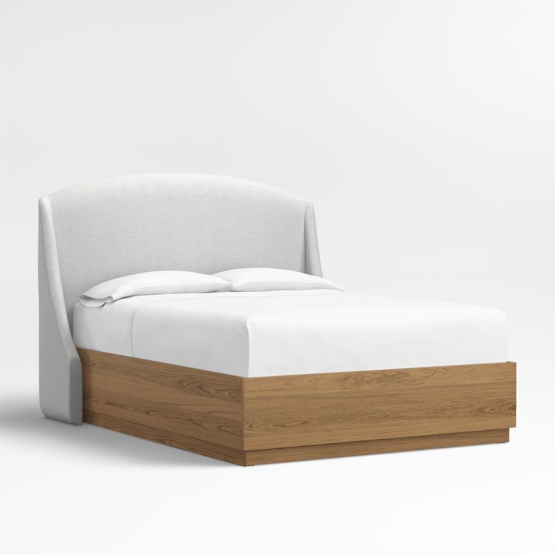 Our custom bed collection lets you mix and match our top-selling headboards and bases for a look that's truly yours. The Lafayette tall headboard gives your bed the sumptuous curves of a French-style chaise with a rounded top and sloped wings. Upholstered in a cool grey linen blend, the elegant headboard pairs beautifully with the Batten bed base, which features a sleek plinth design and the lively grain of oak veneer enhanced with a smoke grey finish. A great choice for storage-challenged bedrooms, Batten seamlessly integrates a drawer at the foot of the base for placing bedding, blankets and out-of-season garments.