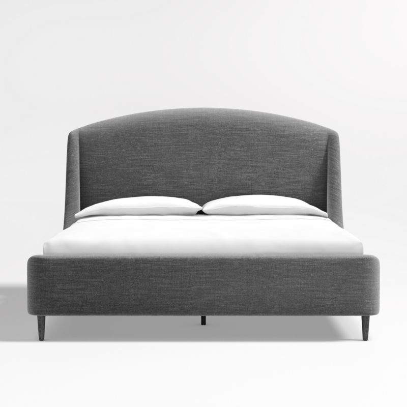 Lafayette streamlines the sumptuous curves of a French-style chaise into an upholstered bed for the modern bedroom. Fully covered in a charcoal linen-like fabric, the bed curves down from a tall, gently rounded headboard to slim rails that gracefully climb to form the lower-profile footboard. Turned solid oak legs have a natural finish to complement the upholstery and keep the look fresh and modern.