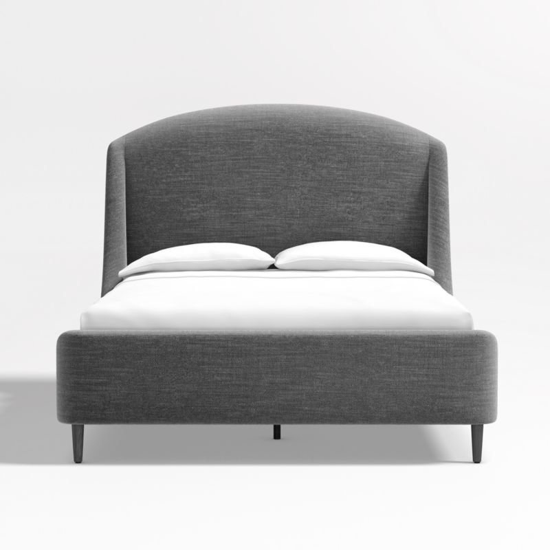Lafayette streamlines the sumptuous curves of a French-style chaise into an upholstered bed for the modern bedroom. Fully covered in a charcoal linen-like fabric, the bed curves down from a tall, gently rounded headboard to slim rails that gracefully climb to form the lower-profile footboard. Turned solid oak legs have a natural finish to complement the upholstery and keep the look fresh and modern.