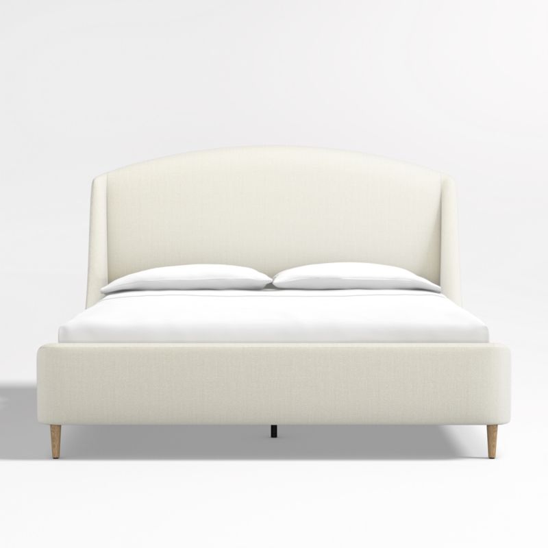 Lafayette streamlines the sumptuous curves of a French-style chaise into an upholstered bed for the modern bedroom. Fully covered in an ivory linen-like fabric, the bed curves down from a tall, gently rounded headboard to slim rails that gracefully climb to form the lower-profile footboard. Turned solid oak legs have a natural finish to complement the upholstery and keep the look fresh and modern.