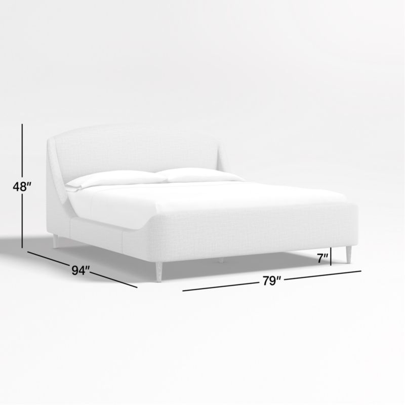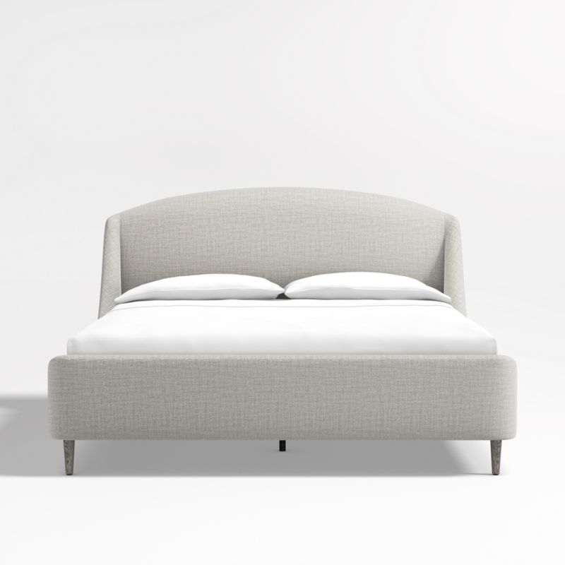 Lafayette streamlines the sumptuous curves of a French-style chaise into an upholstered bed for the modern bedroom. Fully upholstered in a misty linen-like fabric, the bed curves down from the gently rounded headboard to slim rails that gracefully climb to form the lower-profile footboard. Turned solid oak legs have a grey finish to complement the upholstery and keep the look fresh and modern.