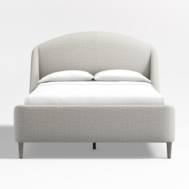 Lafayette streamlines the sumptuous curves of a French-style chaise into an upholstered bed for the modern bedroom. Fully upholstered in a misty linen-like fabric, the bed curves down from the gently rounded headboard to slim rails that gracefully climb to form the lower-profile footboard. Turned solid oak legs have a grey finish to complement the upholstery and keep the look fresh and modern.