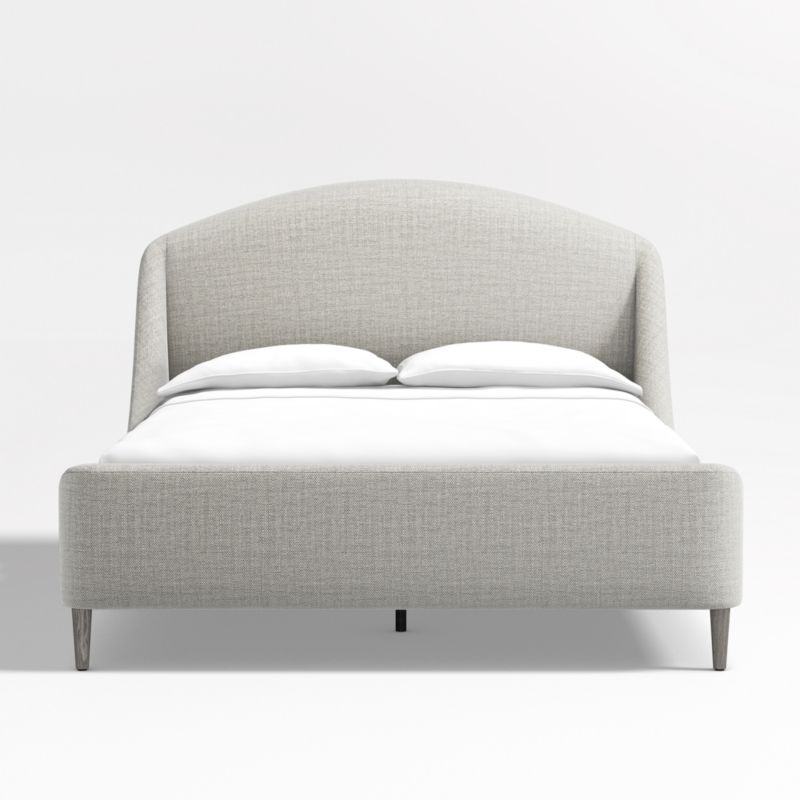 Lafayette streamlines the sumptuous curves of a French-style chaise into an upholstered bed for the modern bedroom. Fully upholstered in a misty linen-like fabric, the bed curves down from the gently rounded headboard to slim rails that gracefully climb to form the lower-profile footboard. Turned solid oak legs have a grey finish to complement the upholstery and keep the look fresh and modern.