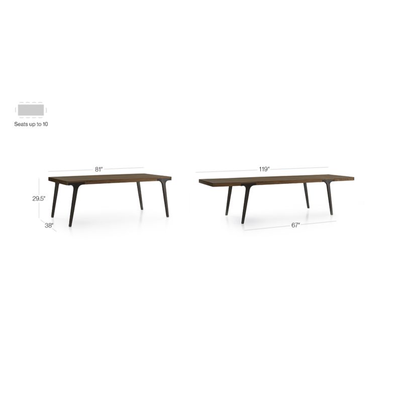 Antiqued to get the look of cast iron, Lakin's metal legs seamlessly integrate with the table's wood apron, angling out for maximum style and legroom. Expandable table features two leaves that expand the table to seat extra guests. The Lakin Extendable Dining Table is a Crate and Barrel exclusive.