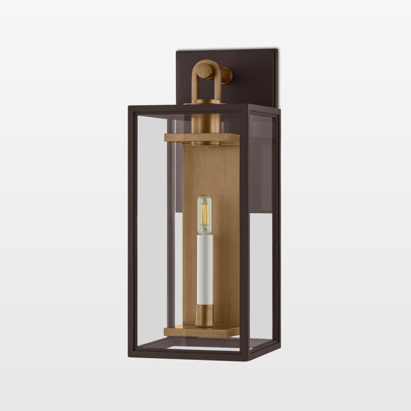 A modern take on tradition, the Lancaster outdoor sconce streamlines the classic lantern for a contemporary look. The textured bronze-finished frame supports panes of glass, while patina brass-finished details reflect light from the candle-inspired socket. Suspended from an elongated loop like an antique lantern, the industrial-chic sconce plays with expectations. Timeless and durable in design, the large sconce offers a warm welcome.