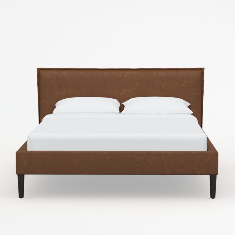 Upholstered by hand in deep brown faux leather, our Lane low-profile bed offers inviting comfort and crisp tailoring. Conical ash wood legs finished in espresso elevate the upholstered platform, and French-seamed edges detail the padded headboard that's ideal for reading, scrolling and breakfasting in bed. With its fully upholstered back, the bed offers flexibility in your bedroom arrangement. Lane keeps the look low and modern, with no need for a box spring. Our Lane saddle-brown faux leather bed is a Crate & Barrel exclusive.
