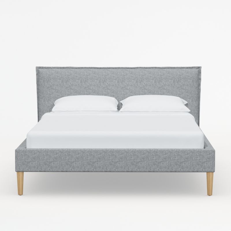 Upholstered by hand in marled grey and white textured linen-blend fabric, our Lane low-profile bed offers inviting comfort and crisp tailoring. Conical ash wood legs with a natural finish legs elevate the upholstered platform, and French-seamed edges detail the padded headboard that's ideal for reading, scrolling and breakfasting in bed. With its fully upholstered back, the bed offers flexibility in your bedroom arrangement. Lane keeps the look low and modern, with no need for a box spring. Our Lane pumice-grey linen bed is a Crate & Barrel exclusive.