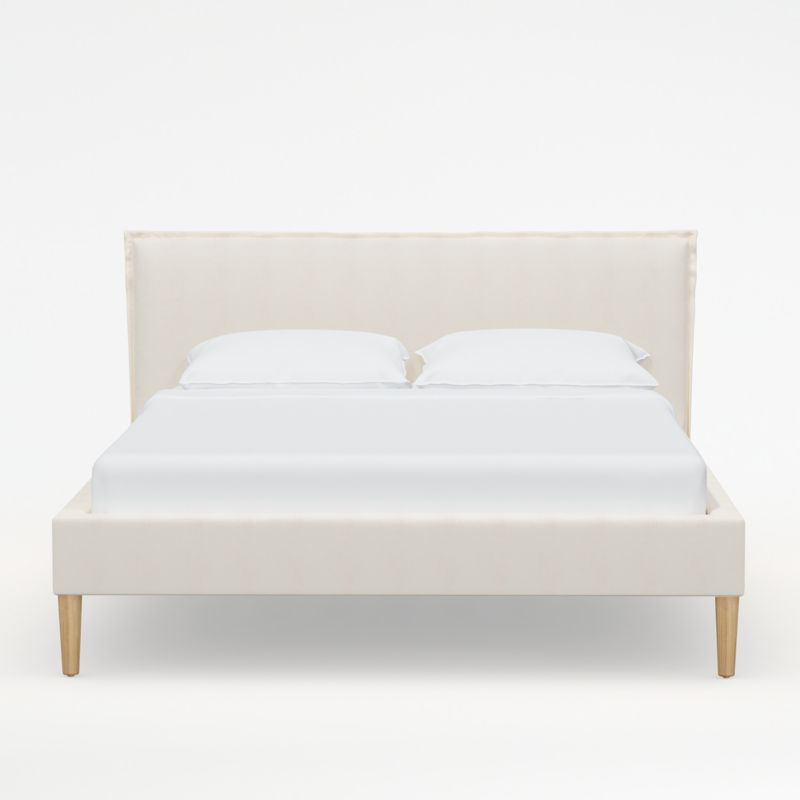 Upholstered by hand in creamy white textured linen-blend fabric, our Lane low-profile bed offers inviting comfort and crisp tailoring. Conical ash wood legs with a natural finish elevate the upholstered platform, and French-seamed edges detail the padded headboard that's ideal for reading, scrolling and breakfasting in bed. With its fully upholstered back, the bed offers flexibility in your bedroom arrangement. Lane keeps the look low and modern, with no need for a box spring. Our Lane white bed is a Crate & Barrel exclusive.