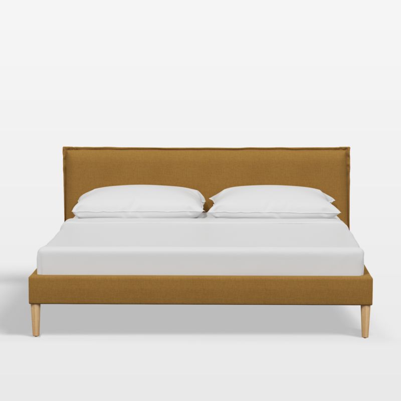 Upholstered by hand in a caramel brown linen-blend, our Lane low-profile bed offers inviting comfort and crisp tailoring. Conical ash wood legs finished in espresso elevate the upholstered platform, and French-seamed edges detail the padded headboard that's ideal for reading, scrolling devices or taking breakfast in bed. With a fully upholstered back, the bed offers flexibility in your bedroom arrangement. The Lane upholstered bed is a Crate & Barrel exclusive.