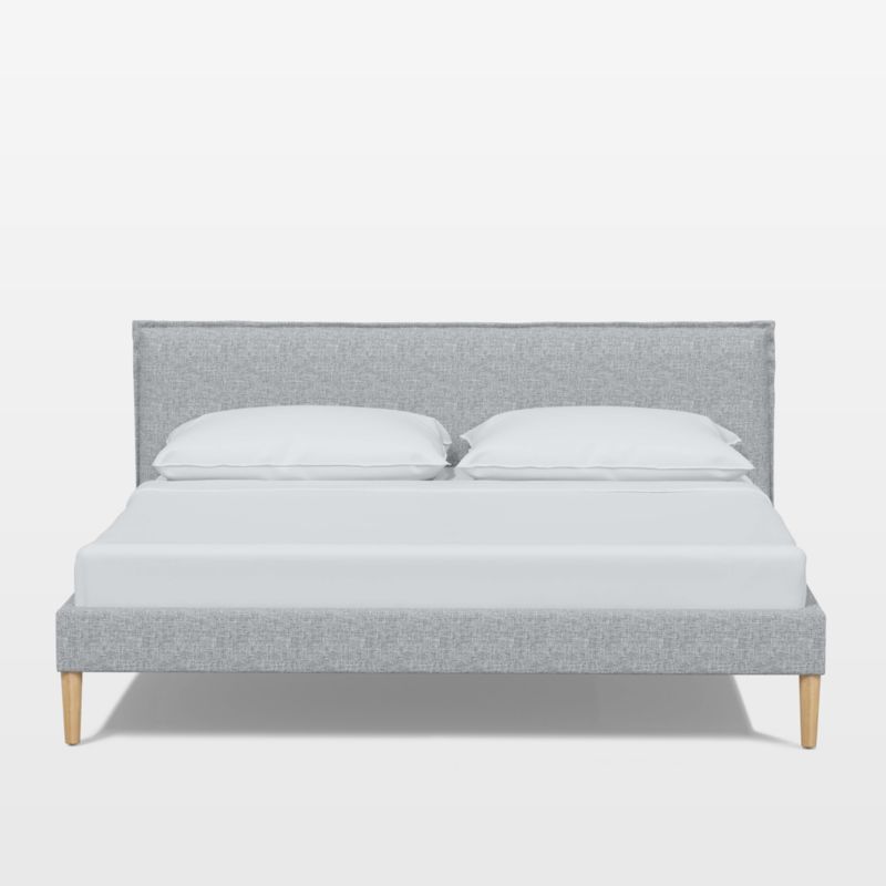 Upholstered by hand in marled grey and white textured linen-blend fabric, our Lane low-profile bed offers inviting comfort and crisp tailoring. Conical ash wood legs with a natural finish legs elevate the upholstered platform, and French-seamed edges detail the padded headboard that's ideal for reading, scrolling and breakfasting in bed. With its fully upholstered back, the bed offers flexibility in your bedroom arrangement. Lane keeps the look low and modern, with no need for a box spring. Our Lane pumice-grey linen bed is a Crate & Barrel exclusive.