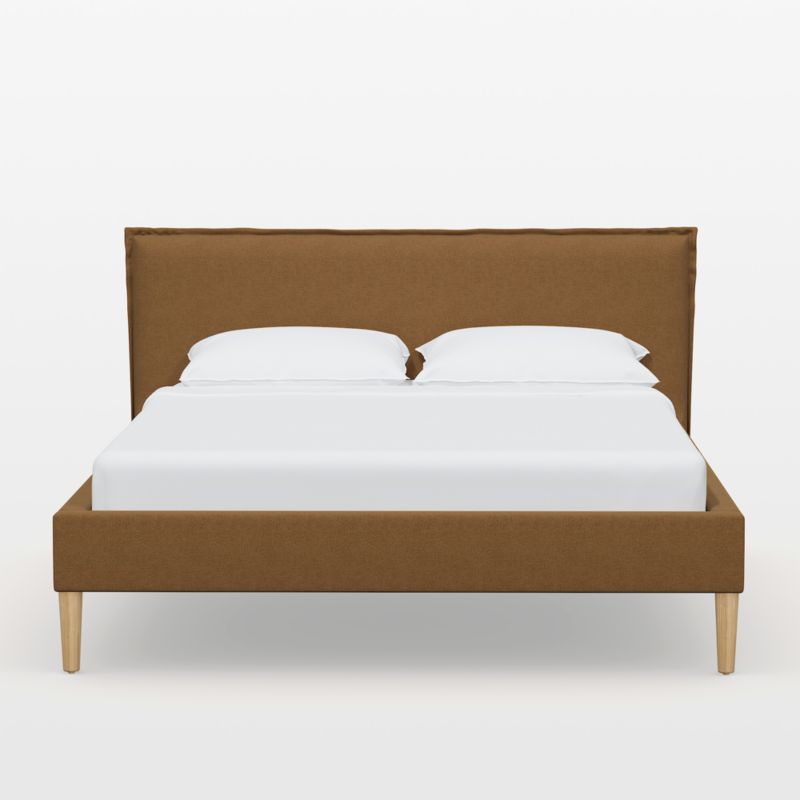 Upholstered by hand in an amber brown linen-blend, our Lane low-profile bed offers inviting comfort and crisp tailoring. Conical ash wood legs finished in espresso elevate the upholstered platform, and French-seamed edges detail the padded headboard that's ideal for reading, scrolling devices or taking breakfast in bed. With a fully upholstered back, the bed offers flexibility in your bedroom arrangement. The Lane upholstered bed is a Crate & Barrel exclusive.