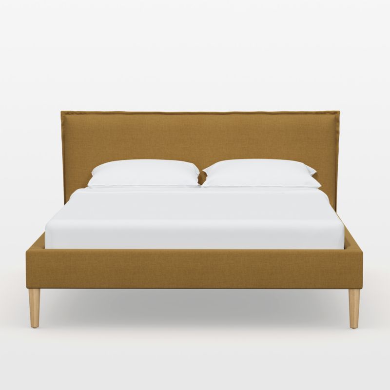 Upholstered by hand in a caramel brown linen-blend, our Lane low-profile bed offers inviting comfort and crisp tailoring. Conical ash wood legs finished in espresso elevate the upholstered platform, and French-seamed edges detail the padded headboard that's ideal for reading, scrolling devices or taking breakfast in bed. With a fully upholstered back, the bed offers flexibility in your bedroom arrangement. The Lane upholstered bed is a Crate & Barrel exclusive.