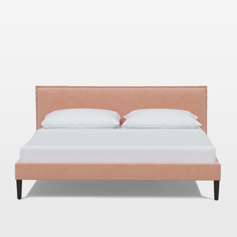 Upholstered by hand in blush velvet, our Lane low-profile bed offers inviting comfort and crisp tailoring. Conical ash wood legs finished in espresso elevate the upholstered platform, and French-seamed edges detail the padded headboard that's ideal for reading, scrolling and breakfasting in bed. With its fully upholstered back, the bed offers flexibility in your bedroom arrangement. Lane keeps the look low and modern, with no need for a box spring. Our Lane pink velvet bed is a Crate & Barrel exclusive.