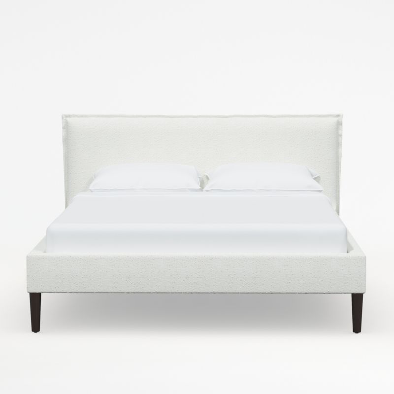 Upholstered by hand in creamy, tweedy white bouclé, our Lane low-profile bed offers inviting comfort and crisp tailoring. Contrasting Conical ash wood legs finished in espresso elevate the upholstered platform, and French-seamed edges detail the padded headboard that's ideal for reading, scrolling and breakfasting in bed. With its fully upholstered back, the bed offers flexibility in your bedroom arrangement. Lane keeps the look low and modern, with no need for a box spring. Our Lane snow-white bed is a Crate & Barrel exclusive.