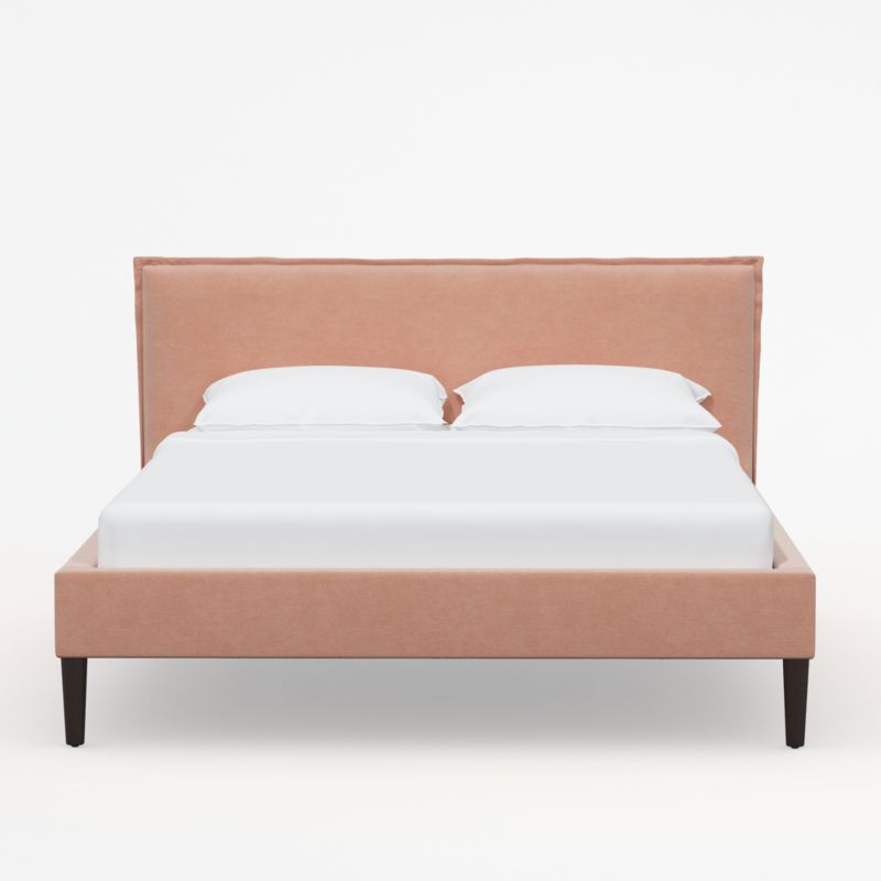 Upholstered by hand in blush velvet, our Lane low-profile bed offers inviting comfort and crisp tailoring. Conical ash wood legs finished in espresso elevate the upholstered platform, and French-seamed edges detail the padded headboard that's ideal for reading, scrolling and breakfasting in bed. With its fully upholstered back, the bed offers flexibility in your bedroom arrangement. Lane keeps the look low and modern, with no need for a box spring. Our Lane pink velvet bed is a Crate & Barrel exclusive.