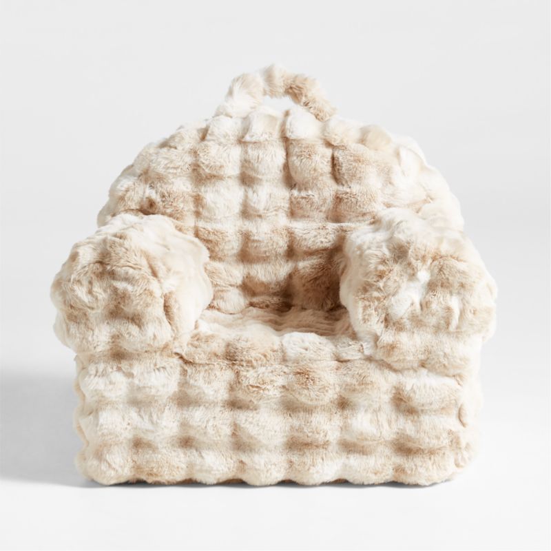 The comfiest seat in the house? Meet our livable and lovable Nod Chair, designed to lounge and look great in any room. With just enough bounce and sized just right, this fan favorite has a frameless foam design that holds its shape through plenty of play. The Arctic Ivory Plush Textured Faux Fur is extra durable and has a soft, gently rippled surface your kiddo will love cozying up to. Perfect for family game nights or morning cartoons, the chairs are easy to tote around thanks to the durable handle up top. A back pocket keeps favorite books close by during storytime. Pro parent tip: The zippered cover is easy to remove and toss in the wash.