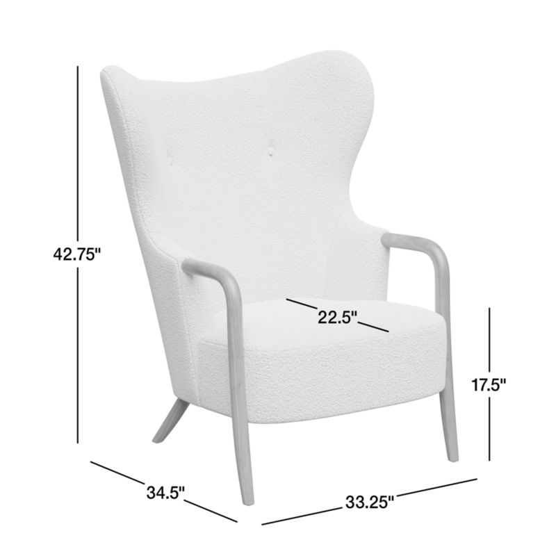 Drawing on classic mid-century modern Danish design, Laso plays with proportion and flow to create a decidedly contemporary silhouette. An exaggerated wingback makes a fresh statement as it shelters a comfortable sit. Sustainably sourced walnut curves legs into arms and angles the back legs. A white wool-blend fabric upholsters the accent chair in the distinct, looped texture of boucle, smartly tailored with blind seams and two button tufts. Sleek and sophisticated Laso anchors any room in timeless style.