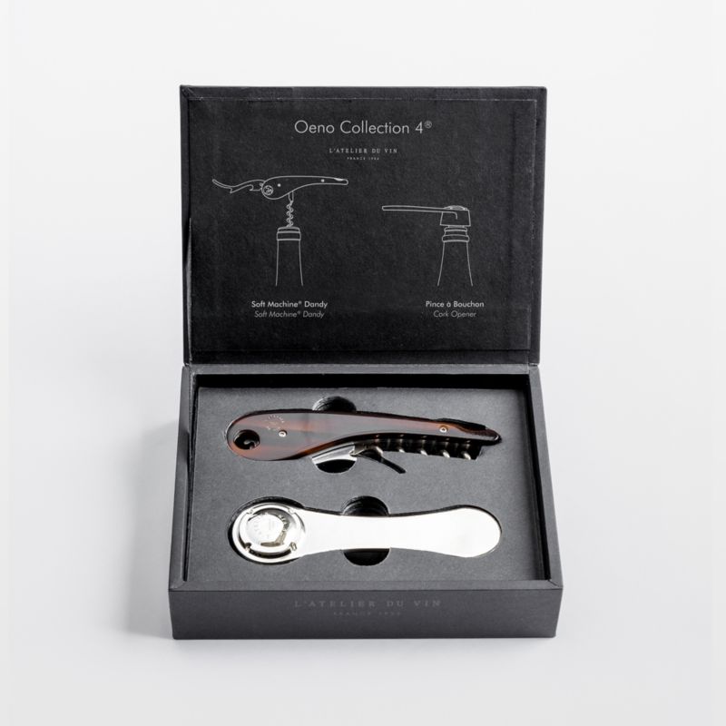 L'Atelier du Vin makes wine tools worthy of your collection. Crafted of stainless steel and brass clad in faux tortoiseshell, the folding corkscrew opens bottles effortlessly without twisting. The chrome-finished cork opener removes corks from bottles of sparkling wine without chaos—no popping or spilling. Position the jaws over the cork and rotate gently until it comes free safely and smoothly. Presented in an elegant gift box, this fascinating French-made set makes a lovely host gift.